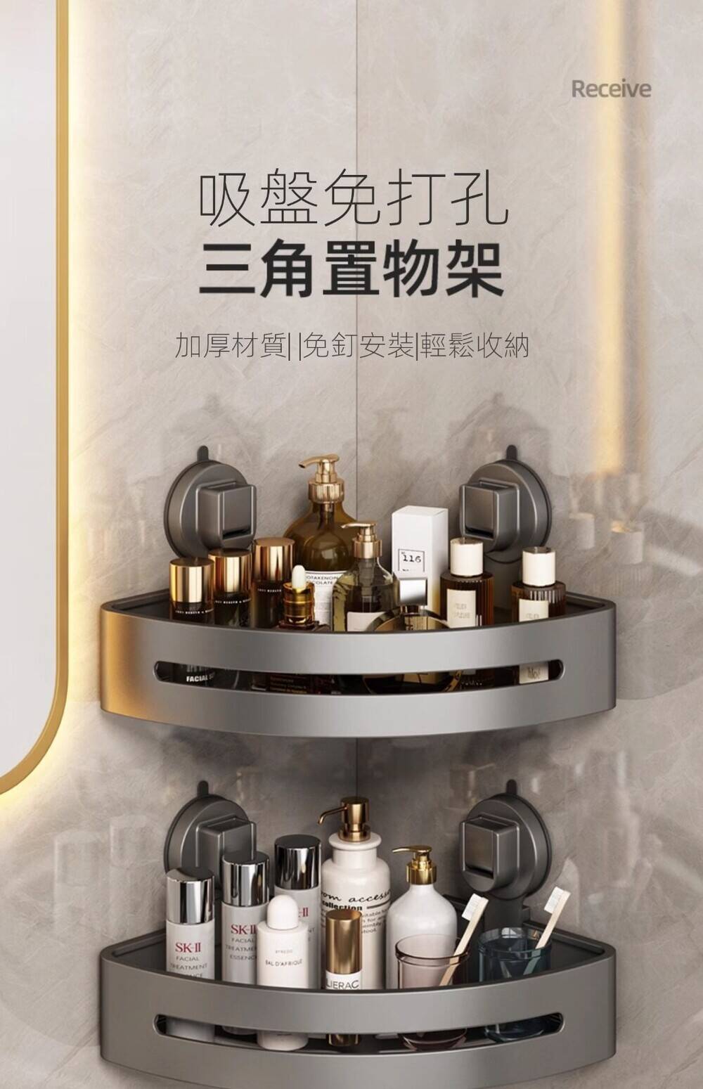 5分鐘前自帶吸盤,可隨時移動重復使用的置物架 免打孔廚房浴室衛生間三角置物架多用途壁掛收納架毛巾架 - 【超夯下殺】買一送二,共三入組 NT$998